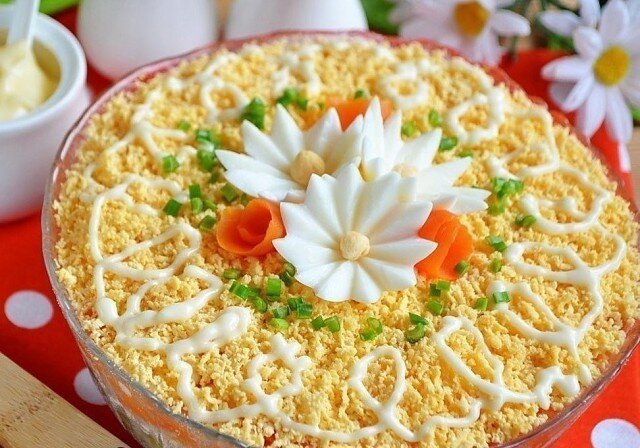 Этот салатик прекрасный вариант для любого праздничного застолья в Вашей семье. Выглядит очень эффектно, а на вкус просто объеденье. Ни один праздник не обойдется без внимания к этому салатику. Обязательно приготовьте для своей семьи. Ингредиенты: ● Куриная печень — 350 грамм ● Огурцы маринованные — 2–4 штуки ● Яйцо крупное — 4 штуки ● Морковь — 4 штуки ● Лук — 4 штуки мелких (или 2 крупных) ● Майонез — 100 грамм ● Соль — по вкусу ● Масло рафинированное — для жарки лука ● Зелень — для украшения салата Приготовление: 1. Отвариваем морковь, яйца и печень до готовности. Остужаем. Очищаем лук, режем его небольшими кубиками. Обжариваем на растительном масле до готовности. Добавляем щепотку соли. 2. Разделяем белки и желтки. Желтки откладываем для самого последнего слоя, а белки натираем на крупной терке. Из части белка можно сделать цветочки для украшения салата. 3. Огурцы режем кубиками небольшого размера. Если огурцы не крупные, то берите четыре штуки, крупных достаточно двух