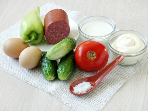 Необходимые продукты: копченая колбаса 150 грамм, 2 яйца, 2 ст.л. молока, 2 свежих огурца, 1 помидор, 1 болгарский перец, майонез, соль по вкусу.