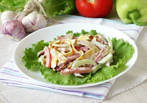 Сладкий перец очищаем от семян и нарезаем соломкой, примерно одинакового размера, с колбасой и огурцами.