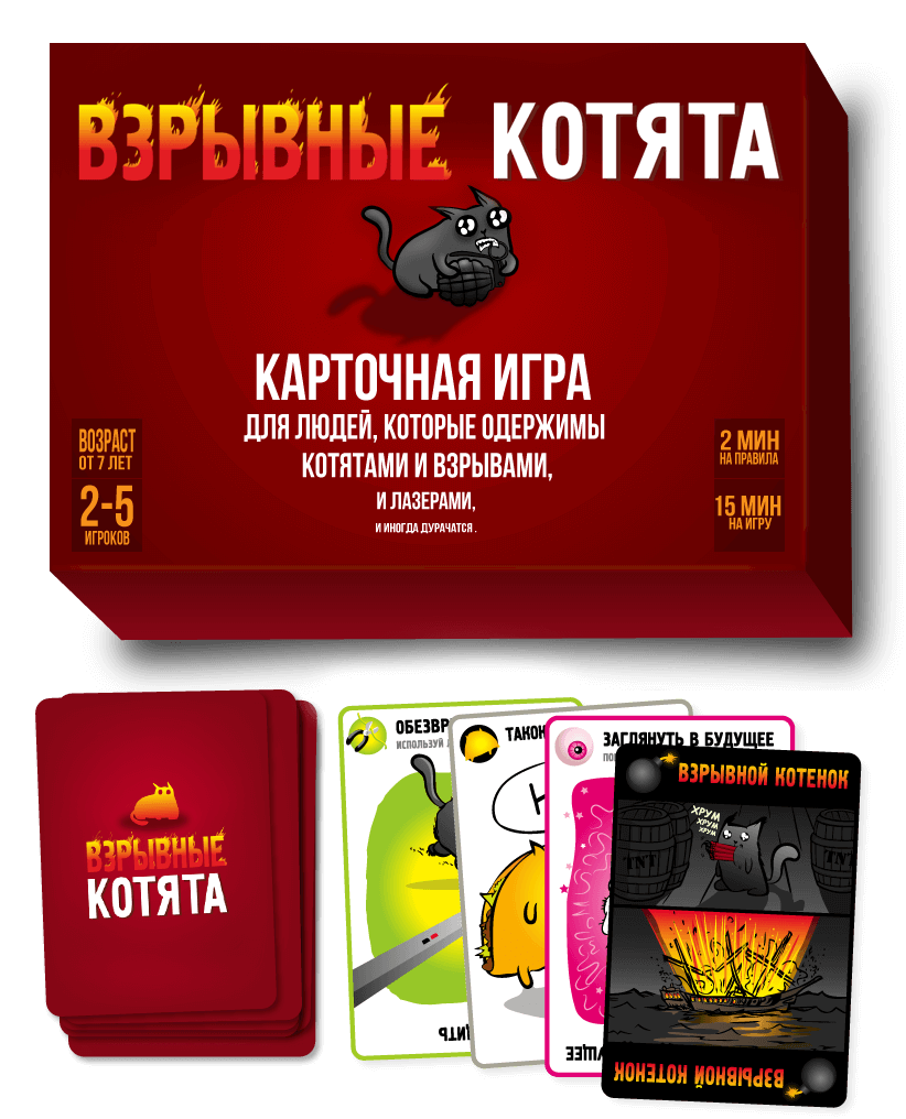 Настольная игра "Взрывные котята" - это веселая карточная игра для небольшой компании, в которой надо постараться не подорваться на случайно выпадающем котёнке-взрывёнке.