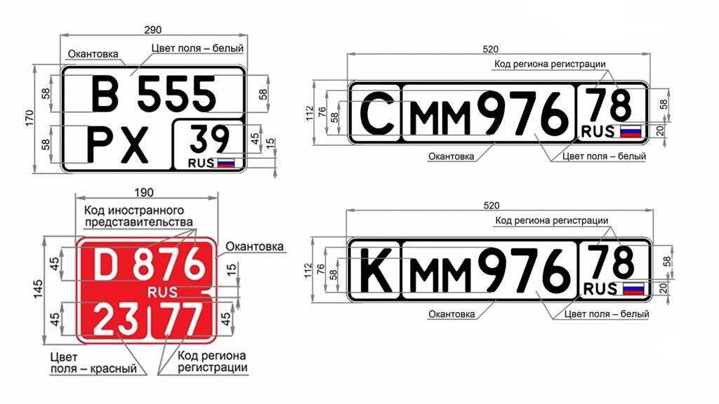 Также станут меньше в полтора раза мотоциклетные номера — 190 на 145 мм. Такое решение было принято из-за того, что в стране много зарубежных мотоциклов, а у них слишком маленькая площадка под номер. Впервые вводятся номера для макси-скутеров. Для них госзнаки будут такого же размера, как для мотоциклов, только с другим набором букв и цифр. Знаки для мотоциклов работников иностранных дипмиссий, а также знаки для квадроциклов будут делаться на красном фоне.