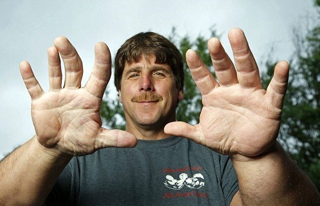 Кто бы мог подумать, но известный персонаж мультиков - "Моряк Папай", имеет прототипа в нашем мире! А сходство базируется на самых выдающихся частях тела героя мультфильма - руках. И зовут его Джефф Дейб. Объем его предплечий составляет почти 50 см (не многие культуристы имеют такой обхват бедра). В настоящие время ему 55 лет, и занимается он армрестлингом. Нельзя сказать, что Джефф страдает гигантизмом, скорее он им пользуется. Хоть Дейб и не является чемпионом в этом виде спорта, тем не менее у него большой соревновательный список, огромный опыт и он также вызывает любопытство у обывателей на соревнованиях по армрестлингу. Кроме того, Джефф Дейб настоящий семьянин, живет в браке и имеет трех детей, кстати, вопреки ожиданиям, его дети родились здоровыми и болезнь не унаследовали. Джефф не очень любит путешествовать на соревнованиях по армрестлингу, предпочитает проводить время дома с семьей. Джефф превратил свой недуг в достоинство, нашел применение своим рукам в том виде спорта, где