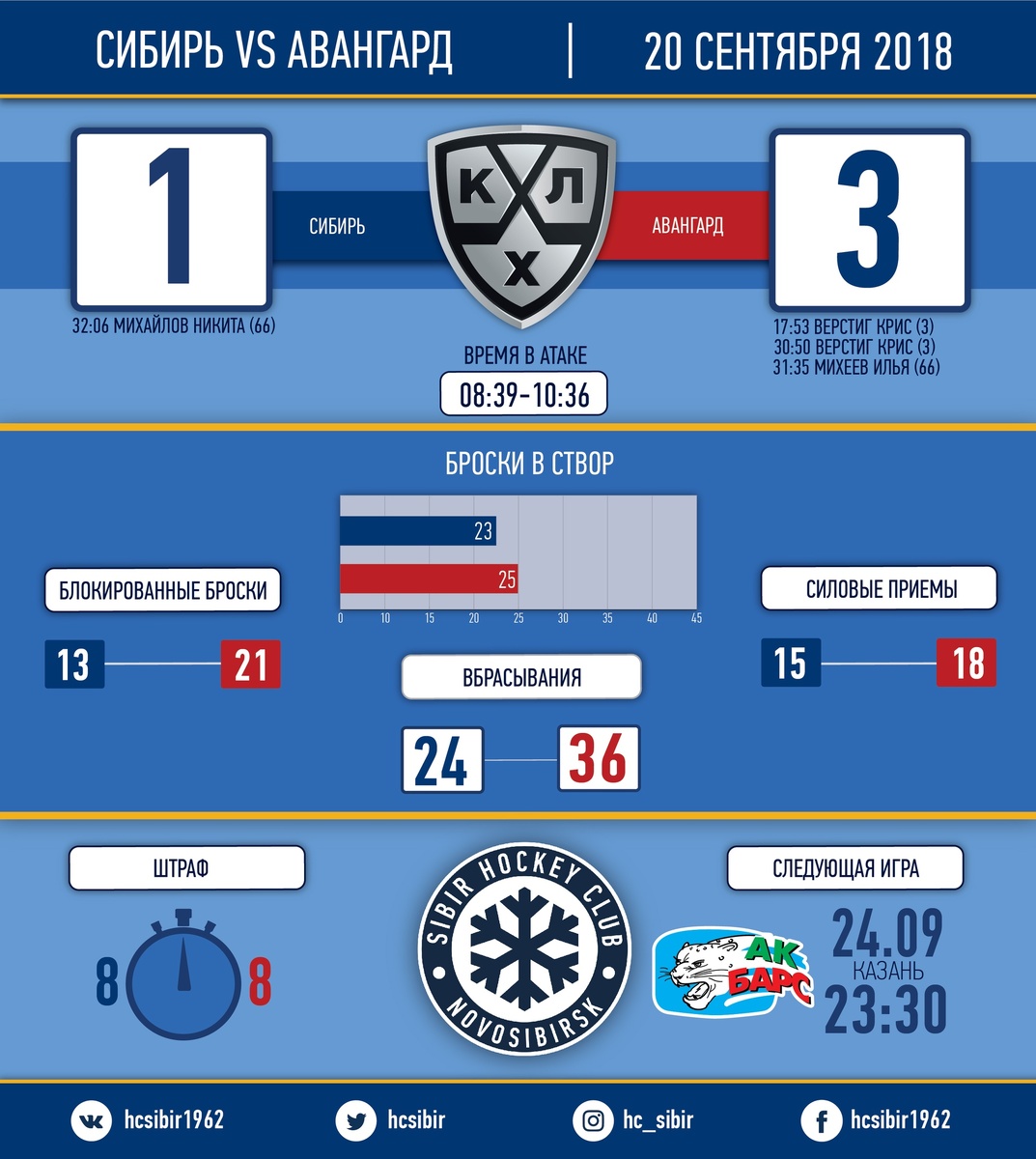 "Сибирь" не смогла набрать очков в матче с "Авангардом" В очередном матче Континентальной хоккейной лиги "Сибирь" на своей площадке проиграла "Авангарду" со счетом 1:3 (0:1, 1:2, 0:0). Шайбу забросил Никита Михайлов. Ворота защищал Алексей Красиков. Статистика матча: Броски: 59-51 ; Броски в створ: 23-25 ; Голы: 1-3 ; Вбрасывания: 24-36 ; Блокированные броски: 13-21 ; Силовые приемы: 15-18 ; Время в атаке: 08:39-10:36 ; Штраф: 8-8. В первом периоде счёт открыл нападающий гостей Крис Верстиг, для которого заброшенная шайба стала первой в Континентальной хоккейной лиге. Во втором периоде стороны забросили три шайбы за 76 секунд игрового времени. Сначала дважды забила команда гостей: заброшенными шайбами отличились Верстиг и Илья Михеев, на что подопечные Александра Андриевского ответили голом Никиты Михайлова. Напоминаем , что это уже 9 поражения для Сибирь в этом сезоне . Помимо этого, «Сибирь» приблизилась к антирекорду КХЛ по количеству поражений со старта сезона. В с