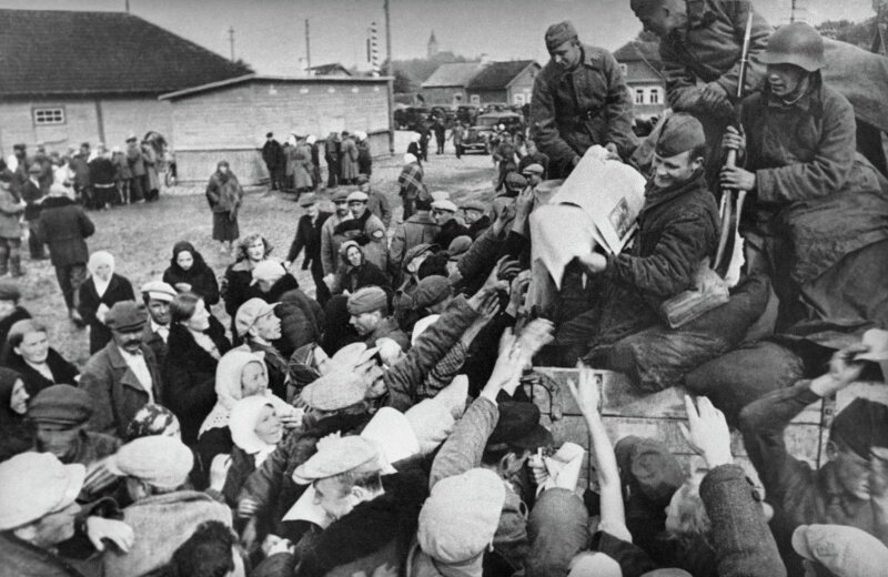 На фото вверху: советские солдаты раздают газеты «Правда» жителям присоединенных к СССР территорий в Западной Белоруссии. Снимок сделан в городе Молодечно (на момент съемки - повет в составе Виленского воеводства. Современная территория Минской области Белоруссии).