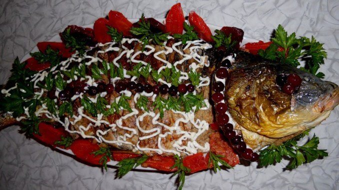 Мясо карпа признано диетологами как легкоусвояемый и низкокалорийный продукт, богатый белками и разными полезными микроэлементами, не имеющий противопоказаний к потреблению. Кроме того, это очень вкусная рыба. Так что кушать ее просто необходимо. Вопрос, как лучше приготовить. Карп, как и всякая другая рыба, великолепно сочетается с овощами. В этом рецепте предлагается запечь его с капустой и шампиньонами. Вам потребуется: Как готовить: 1) Очистите и выпотрошите карпа. Хорошенько промойте его и обсушите. Поперчите, посолите. Закончив эту предварительную обработку, оставьте рыбину на два часа. 2) Подготовьте начинку. Вымойте капусту, удалите поврежденные листья, затем нашинкуйте ее соломкой. Шампиньоны вымойте, порежьте некрупными пластинами. Луковицу очистите, обмойте, измельчите. Все соедините, выложите в масло и до готовности обжарьте. Положите в полученную начинку соль и перец. 3) Начините брюхо рыбины капустой с грибами. Смажьте противень, аккуратно выложите на него фаршированног