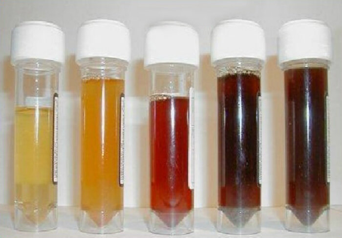 Каждый день мы несколько раз ходим в туалет "по-маленькому", но часто не обращаем внимание на цвет нашей мочи. А зря, так как цвет мочи может сообщить нам о наличии тех или иных патологий, или о недостатке каких-либо веществ. Немного теории В состав урины человека входит более 120 компонентов. На 99% она состоит из воды, а на 1% приходятся все остальные компоненты. За окраску мочи, в первую очередь, отвечают пигменты: урохром, уроэритрин, урозеин, стеркобилин и другие. Если концентрация пигментов в урине изменяется, то изменяется и цвет мочи. Соответственно по цвету мочи, можно определить, каких пигментов в моче больше нормы и узнать о наличии той или иной патологии или нехватки веществ. Нормальный цвет мочи Для урины человека нормальным цветом считается: бледно-желты, светло-желтый и темно-желтый. Эти оттенки чаще всего говорят о количестве воды, которую потребляет человек. Недостаток или переизбыток воды Урохром - основной пигмент урины человека. Урохром окрашивают мочу в желтый цве