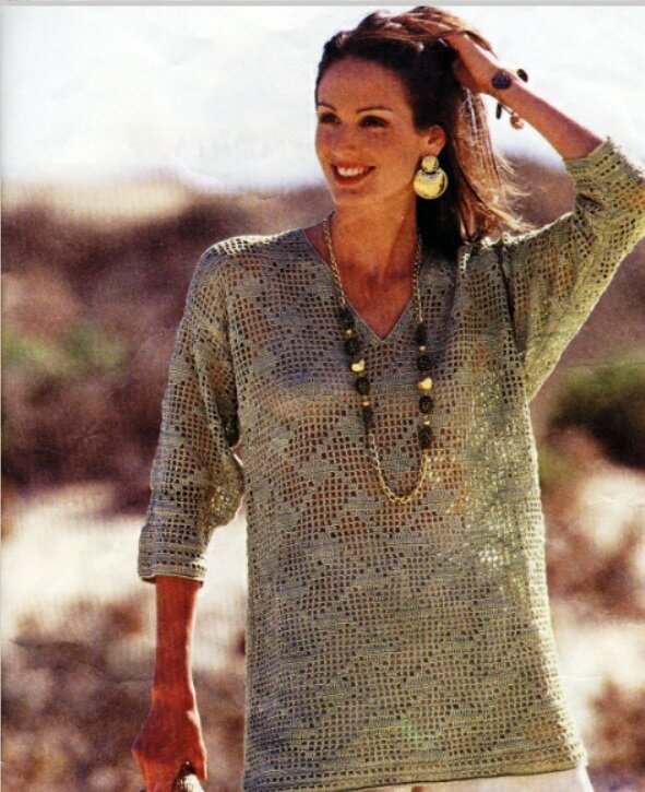 Покопалась в своих "закромах" и нашла описание вот такой туники: Хотя лето уже и закончилось, но надеюсь, что оно было не последнее. Да и уж очень понравилась и я решила поделится с вами, мои дорогие читатели схемами и описанием. Вяжется туника крючком 2,5 из 100% хлопка 223 м/ 50 г. Понадобится 450/500/550 грамм. Размеры: 36/38, 40/42 и 44. Основной узор вяжется по схеме, при этом каждый ряд начинать 3 воздушными петлями подъема, равными одному столбику с накидом. Плотность вязания: 33 п. на 13,5 р. получается 10 на 10 см. Перед: связать цепочку из 182/194/206 п. + 3 воздушные петли подъема и вязать основным узором от стрелки А/В/С. На высоте 48 см от начала работы убавить для пройм с обеих сторон 0/6/12 петель. На высоте 52,5/53,5/55 см от начала работы оставить для V-образного выреза горловины средние 3 петли и заканчивать обе стороны отдельно. Убавить по краю выреза горловины в каждом ряду 27 раз по одной петле и на высоте 74/75/76,5 см от начала работы закончить вязание. Спинка: