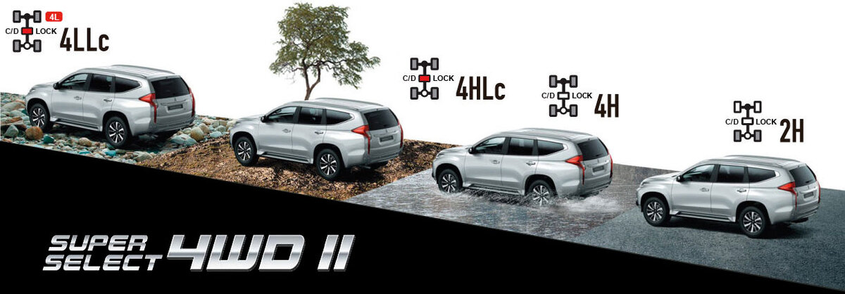4WD или полный привод, для легкого бездорожья. Подключаются оба моста. Благодаря трансмиссии Super Select 4WD появляется возможность переключаться с экономичного режима привода на одну ось, на режим полного привода, во время движения на скорости до 100 км/ч - это очень удобно, когда дорожное полотно неожиданно становится скользким.