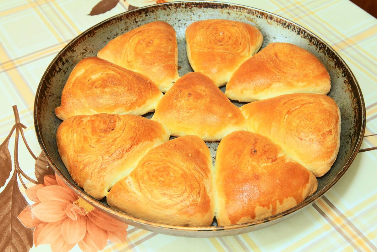 Әзер сумсаларны кабартып алабыз. Өстенә йомырка сарысы сөртәбез һәм 15-20 минутка 200 градуска кадәр җылытылган мичкә куябыз.