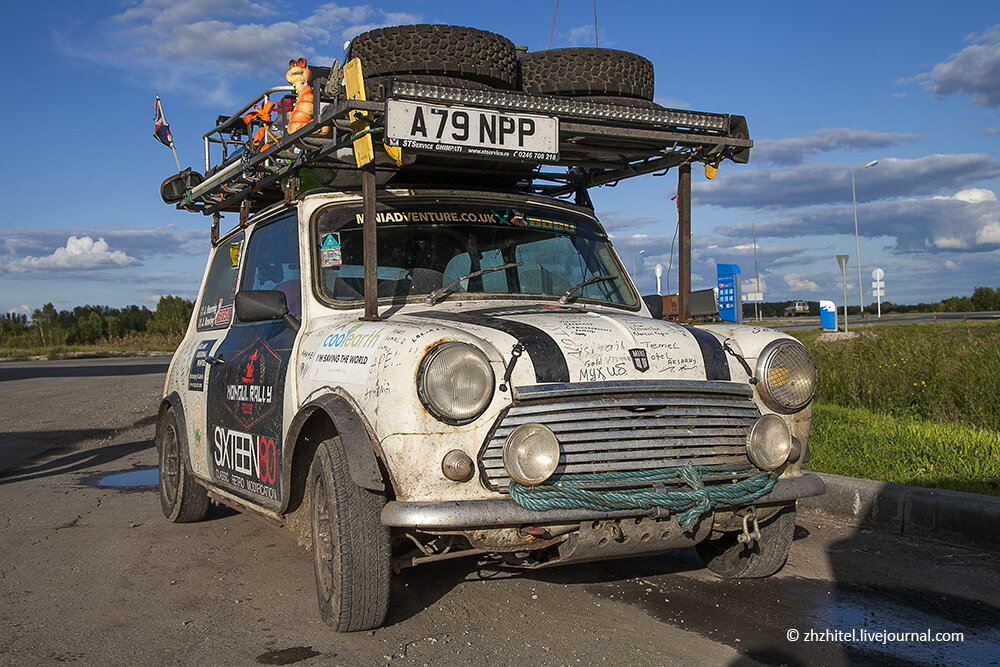 На перегоне от Новосибирска до Екатеринбурга встретили необычный автомобиль. Крошечный Mini с английскими номерами весь исписанный маркером, с большой наклейкой Mongol Rally 2018 во всю дверь. Трудно поверить, но именно на этом чуде совершено грандиозное путешествие от Великобритании до Монголии и обратно. Мы решили познакомиться с водителем. Джейм Хёрниг (справа, слева — автор этого канала) любит путешествия и называет себя сумасшедшим. Да, отважиться на такое путешествие сможет далеко не каждый. Джеймс не говорит по-русски, а на российских дорогах не везде говорят по-английски. Тем не менее, его не раз выручали и помогали. Для того, чтобы машина смогла отправиться в такую дальнюю дорогу, на ней был установлен самодельный багажник, который тянет на полноценный второй этаж. Здесь разместились шины, канистры и прочие необходимые принадлежности. Сами понимаете, места в Mini совсем немного. Помимо сугубо утилитарных вещей нашлось место и необычному пассажиру. Изучать надписи на кузов