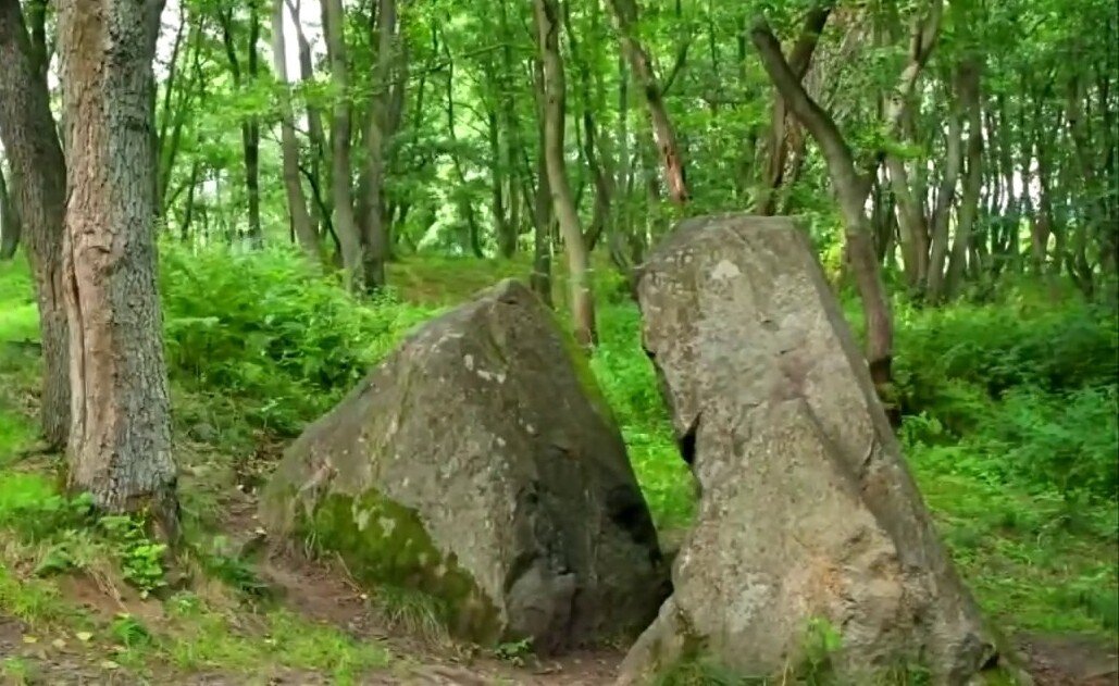 Так разговаривая, мы дошли до столба с указанием расстояния 43 км и начали спускаться по крутому склону в овраг, на дне которого журчала речка Чистая и вскоре были на месте. Еще издалека я увидел огромный, выше среднего человеческого роста валун, расколотый надвое. Он как бы рос из земли в окружении четырех деревьев. Причем одна из половинок валуна была сильно наклонена, и в некоторых местах на нем рос зеленый мох. Между его частями был довольно узкий проход, через который крупному человеку можно было пройти с трудом…