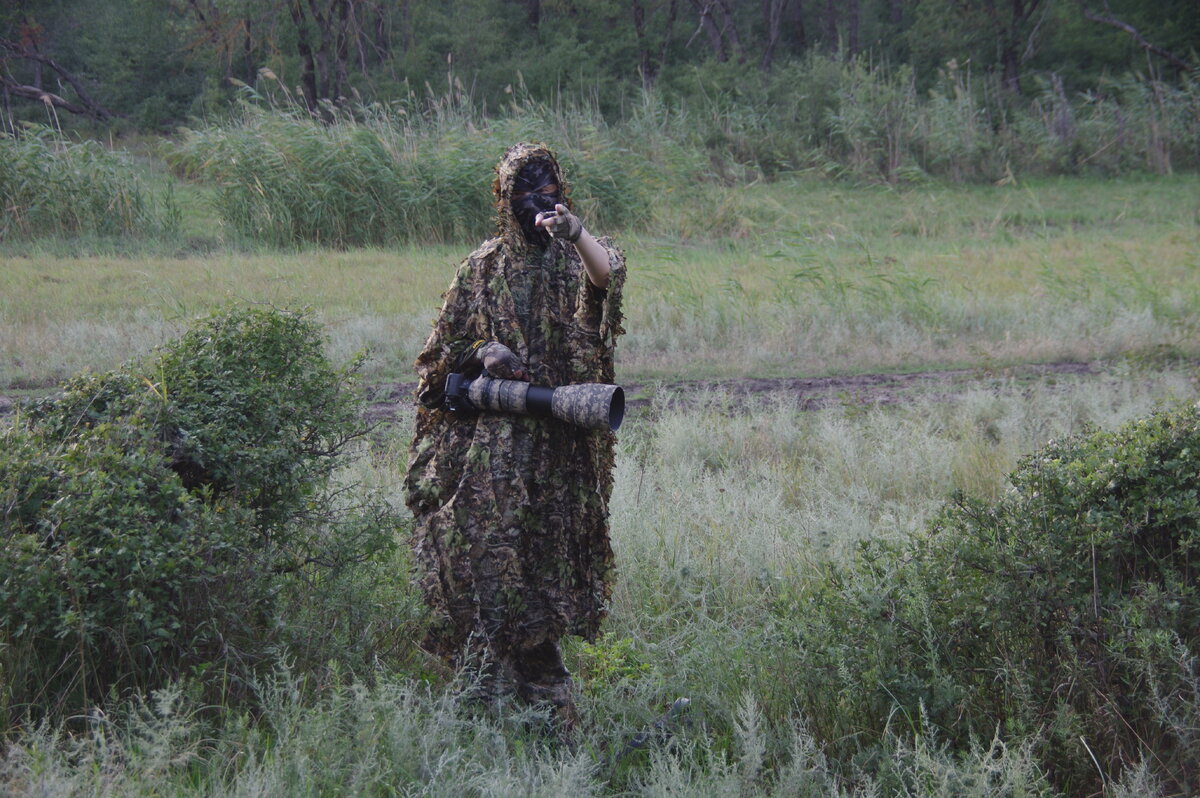 Это довольно спорная тема. Есть один лагерь мнений, придерживающийся идеи обязательности ношения камуфляжа на фотоохоте. Другие же - ярые противники. Аргументы вторых это опасность для фотографа и неэффективность маскирующих средств. Т.к. фотоохота ведется зачастую в тех местах, где есть охотники с ружьями, не рекомендуется использовать камуфляж, дабы не быть подстреленным.