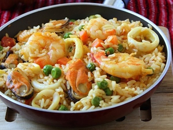 Морепродукты – отличный вариант низкокалорийной пищи, содержащей максимум полезных свойств. Самым доступным видом морепродуктов остаётся морской коктейль-микс из креветок, мидий, кальмаров и осьминогов. Как правило, к нам попадает замороженный морской коктейль, расфасованный в пакеты или упакованный в вакуумную оболочку. Всегда можно быстро приготовить лёгкое блюдо, главным ингредиентом которого станет морской коктейль, имея в морозилке упаковку-другую свежих морепродуктов. Ингредиенты: Способ приготовления: Лук нарезать тонкими полукольцами, перец и цуккини – кубиками, чеснок измельчить, при помощи чеснокодавки. Морской коктейль разморозить, воду слить. На разогретом масле обжарить лук и чеснок 2 минуты, добавить морской коктейль, нарезанные овощи. Перемешать и готовить 2-3 минуты на среднем огне под закрытой крышкой. При необходимости влить немного кипячёной воды. Тушить 5 минут. Добавить к морепродуктам консервированный горошек. Сухую рисовую крупу промыть, затем за