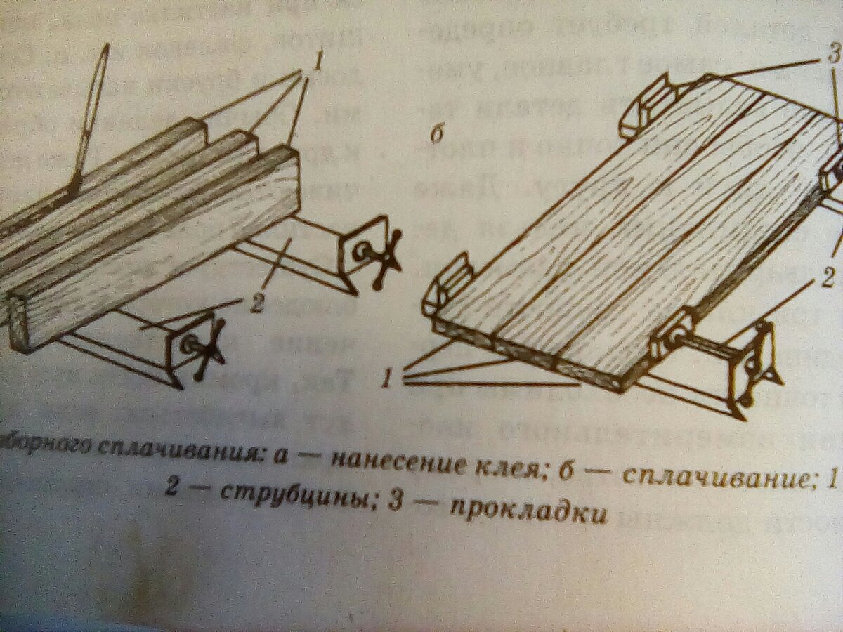 При изготовлении щитов, филенок и т.п. соединение делянок делают неразборными, клееным. Эта операция выполняется с помощью специальных столярных приспособлений - струбцин или сжимов. На сухие, чистые, хорошо обработанные кромки делянок наносят клей ( столярный, ПВА, и др.), если нужно, выдерживают, соединяют склеиваемыми поверхностями и сплачивают их струбцинами или сжимами. Чтобы не повредить кромки изделия, между крайними делянками и деталями струбцин помещают прокладки из древесины или фанеры.