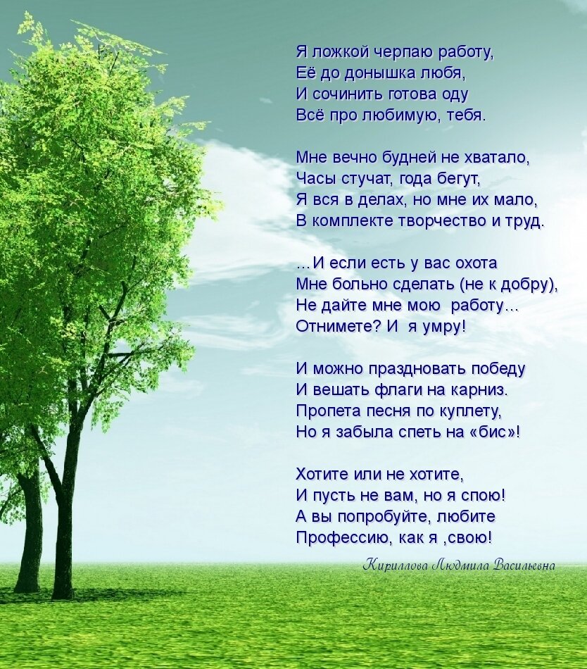 Обожаю свою профессию. Счастливый я человек!!! Всю жизнь на своём месте.... Ни дня на чужой табуретке не сидела)))