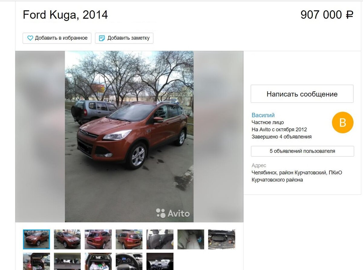 Начнем с Ford Kuga 2014 года, 1 владелец, пробег около 80.000 км, 1.5 л. на 150 сил. В объявлении четко сказано, машина не бита, не крашена, не подкрашена, и не имеет никаких ДТП. И вообще, эта машина своевременно обслуживалась, да еще и зимняя резина есть! А это значит, если переехать жить в Сочи, то можно продать резину и получить прибыль. Пока одни плюсы! И все это чудо за смешные 907.000 рублей, каких не хватит даже на топовый Solaris. Причина продажи - отъезд на ПМЖ на дальний восток, а там, в мире правого руля этот Ford не будет нужен никому. Поэтому решили продать здесь, и уехать на ДВ.