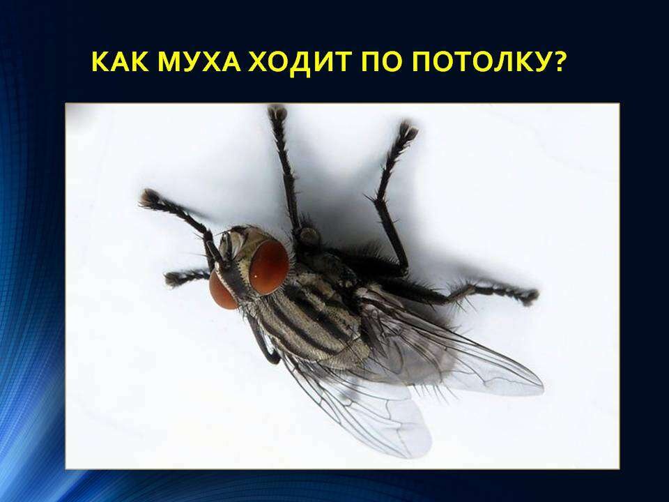 Лапки насекомых заканчиваются коготками, которые помогают им удерживаться на различных поверхностях. Эти коготки обычно захватывают неровности на шероховатых поверхностях. Ведь поверхности, кажущиеся нам абсолютно гладкими, имеют на самом деле массу микроскопических выпуклостей и бороздок. Они и служат точками опоры для крошечных коготков. А вот что касается мух то у них на лапках присутствуют специальные подушечки железы. Данные подушечки выделяю сахар и жир за счет чего они приклеиваются к гладкой поверхности. Как же мухи отклеиваются? Оказалось, что муха использует для этого аж четыре способа! Впрочем, принцип действия всех четырех способов одинаков: мушиная лапка не отрывается перпендикулярно поверхности, а отслаивается под углом, меньшим 90 градусов. В этом случае сопротивление отслаиванию в разы меньше, так как при этом подушечки отстают от поверхности небольшими участками, ряд за рядом, а не одновременно по всей площади.