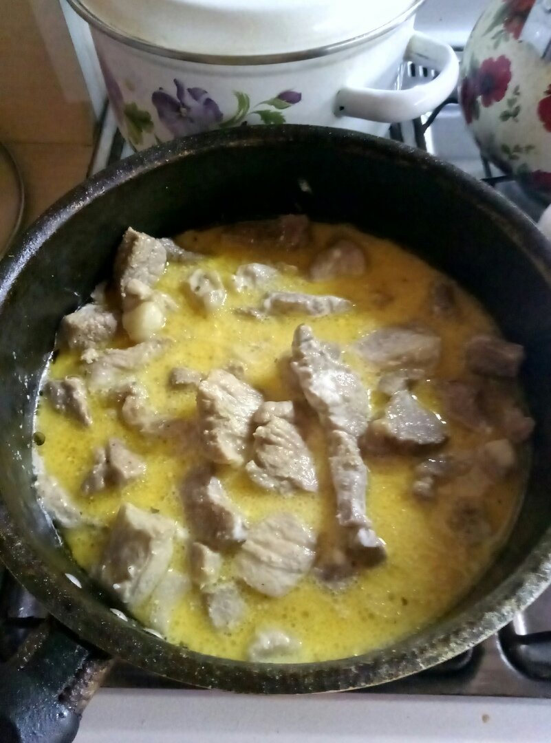 Вам потребуется: 1. 1 кг свинины 2. Сметана 3. Куриный бульон 4. Соль, перец черный молотый 5. Растительное масло 6. Сыр Итак берем мясо обжариваем его до золотистой корочки, после добавляем туда 2 ложки сметаны и поливаем все куриным бульоном, и пускай тушится минут 20-30. После можно натрите сыр на крупной терке и закройте крышкой. Подлив готов. Всем приятного аппетита, спасибо что дочитали мою запись до конца, подписывайтесь на мой канал, ставьте лайки.