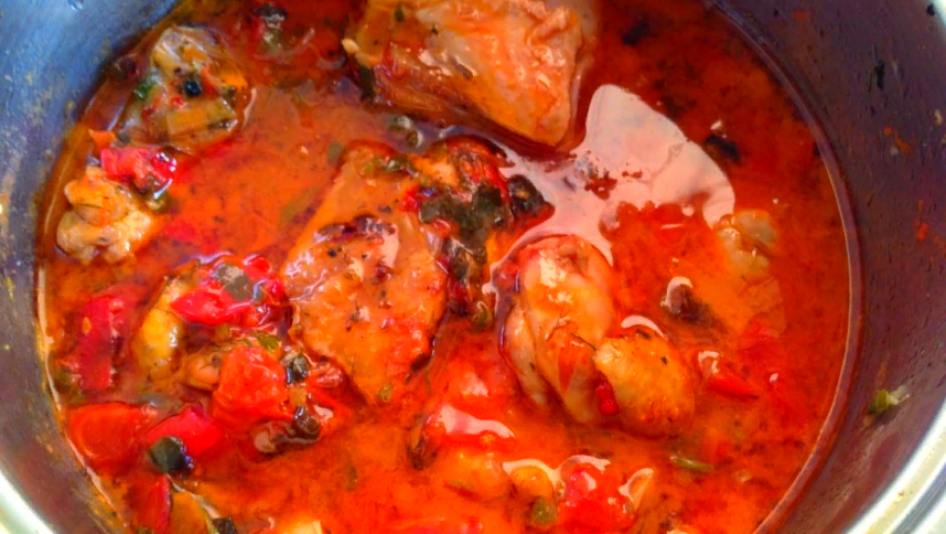 1.Цельный кусок курицы разделать на части .Зажарить на сковородке, затем убрать.Выложить в чугунную сковородку или утятницу порезанный лук, томатную пасу, уксуса 9 %, бокал вина, влить бульон 100 гр, посолить и поперчить.