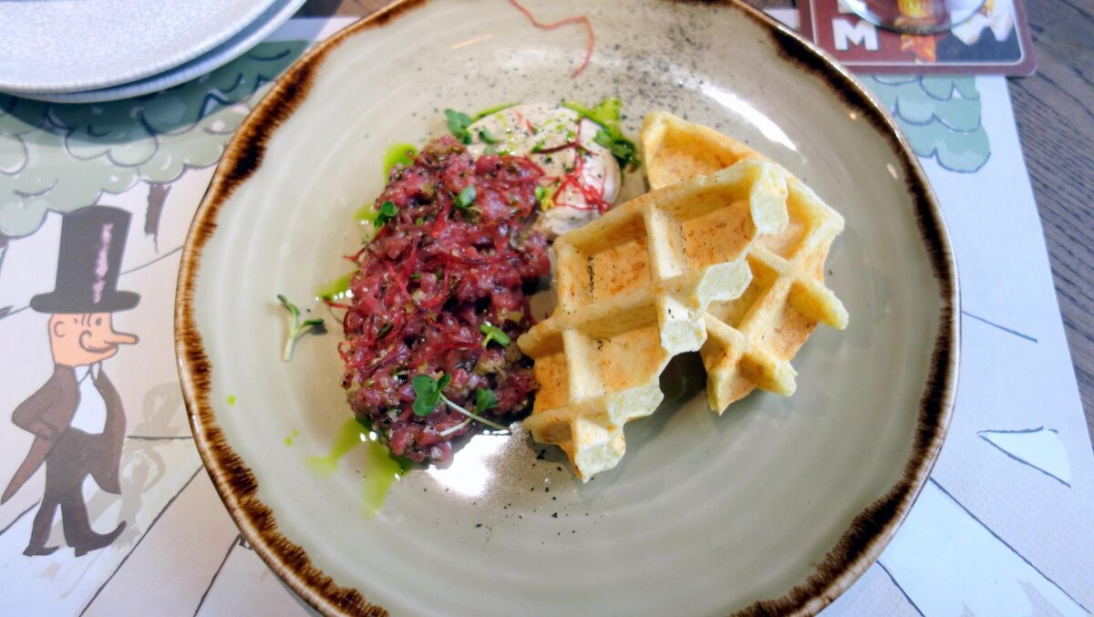 За команду «Итали Групп» выступает новый, пятый, бельгийский паб. Тартар из говядины (550) — картофельную вафлю я не понял совсем. Впервые ем такую. Не читал бы меню, гадал, из чего это сделано: пресная сухая белесая субстанция из крахмала в формочке. Люди, что вы сделали с картошкой? Если она вообще была в основе. Сам тартар с приятной кислой нотой, первой и ведущей после лука, пока не начал мешать с соусом. Тут вкус из классики становится фирменным. Очень хорошо, а вафля — караул.