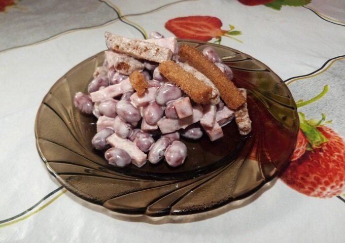 Вкусный салат с фасолью, сухариками и колбасой: рецепт на 10 минут