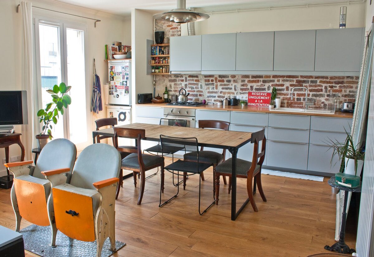 Более 10 лет назад купленная квартира в Париже дожидалась реновации. Любимые квадраты, оформленные по традиционному французскому рецепту, давно не радовали хозяина апартаментов — Себастьяна — режиссера в кинематографе, т.к. все комнаты были небольшого размера: на месте нынешней кухни располагалась спальня, а на месте нынешней душевой ютилась малюсенькая кухня, в которую не было возможности поставить даже стол на 4 персоны. Встречая друзей, приходилось пробираться через узкий коридор к импровизированной гостевой зоне . Желая перемен, хозяин квартиры вдохновился абстрактными изображениями на только что купленных обоях, подготовил план будущей планировки и отправился к своему зятю, который по совместительству является еще и архитектором. Благодаря тому, что все ненесущие стены были демонтированы, пространство вокруг стало наливаться естественным светом и походить на лайтовую версию модного лофта по-французски. После проведенной реконструкции, на 55-квадратах удалось выделить пять самост