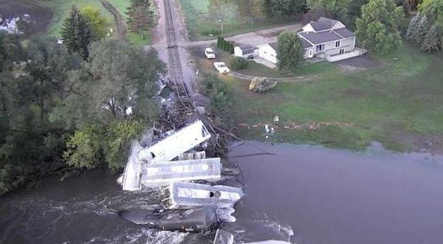 В американском штате Айова обрушился железнодорожный мост, в результате чего грузовой поезд упал в реку. Как сообщает Wowt News, 20 вагонов с песком и соевым маслом оказались в воде. Часть груза попала в реку. По предварительным данным, в результате ЧП никто не пострадал. Как заверила местные власти, утечек в воду не произошло. Причиной обрушения моста называют сильные дожди и наводнения, которые недавно прошли в регионе.