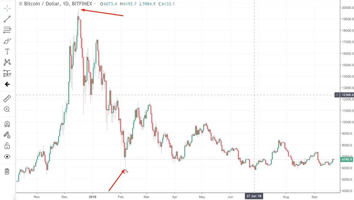 Я заметил весьма интересный паттерн, который, возможно, заметили и многие из вас, но я считаю, что нужно более подробно остановиться на нём, объяснить почему он полезен и как мы можем его применять. На дневном графике Bitcoin можно отметить 3 важные точки: пик в декабре 2017 и два нижних значения в феврале и июне 2018. В любом ПО для работы с графиками есть коррекция по Фибоначчи (Fib Retracement), и, чтобы им воспользоваться, нужно растянуть сетку от пикового значения к самому низкому. В собственных настройках этого индикатора я использую 38.2% и 61.8% как ключевые уровни, так как они важны не только на графиках, но и в природе в целом. На примере роста в апреле-мае 2018 мы видим, как цена прошла коррекцию на 61.8%, после чего не смогла удержаться и снова пошла вниз. Также произошло и после очередного снижения цены в мае и роста в июне-июле. Это довольно распространённое поведение рынков, и часто коррекция происходит именно в диапазоне от 38.2% до 61.8%, если цене не уда