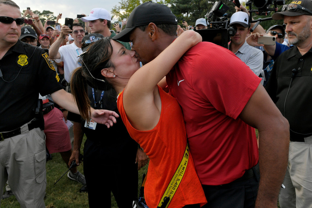 Победный круг Тайгера Вудса включал сладкое объятие с подругой Эрикой Герман .