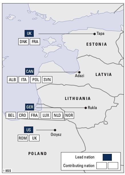 Латвийский Адажи — военнослужащие из Албании, Словении, Польши, Италии. Возглавляет группа канадских военнослужащих в количестве 450 чел. из механизированного батальона пехоты с бронемашинами. Другие страны — сапёры, механизированная рота, танковая рота, специалисты по оружию массового поражения и др., всего 1200 чел.
