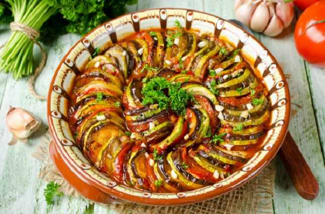 Вот и наступила осень, надо ловить последнюю возможность по максимуму запастись на зиму витаминами и полезными микроэлементами. В этом деле нам лучше всего помогут овощи и желательно их не жарить и не варить, а запекать. Так что сегодня хочу предложить вам приготовить очень красивое и вкусное блюдо французской кухни "Рататуй". Его можно будет готовить конечно же и зимой, но вкус и аромат блюда будет значительно проигрывать осеннему варианту - овощи зимой совсем не те. Так что следует поспешить, тем более что готовить его проще простого) Нам понадобится: молодой кабачок баклажан 3 помидора луковица болгарский перец 4 зубчика чеснока несколько веточек тимяна и розмарина 2-3 столовых ложки подсолнечного масла соль, перец - по вкусу. Кстати, о вкусной и здоровой еде еще можно прочитать здесь: Минтай в духовке под сметанным соусом - просто объедение! Ленивая лазанья в баночке - вкусный и удобный ланч Веер из баклажанов - просто и оччень вкусно! "Золотая рыбка" - вкусный и красивый рыбн