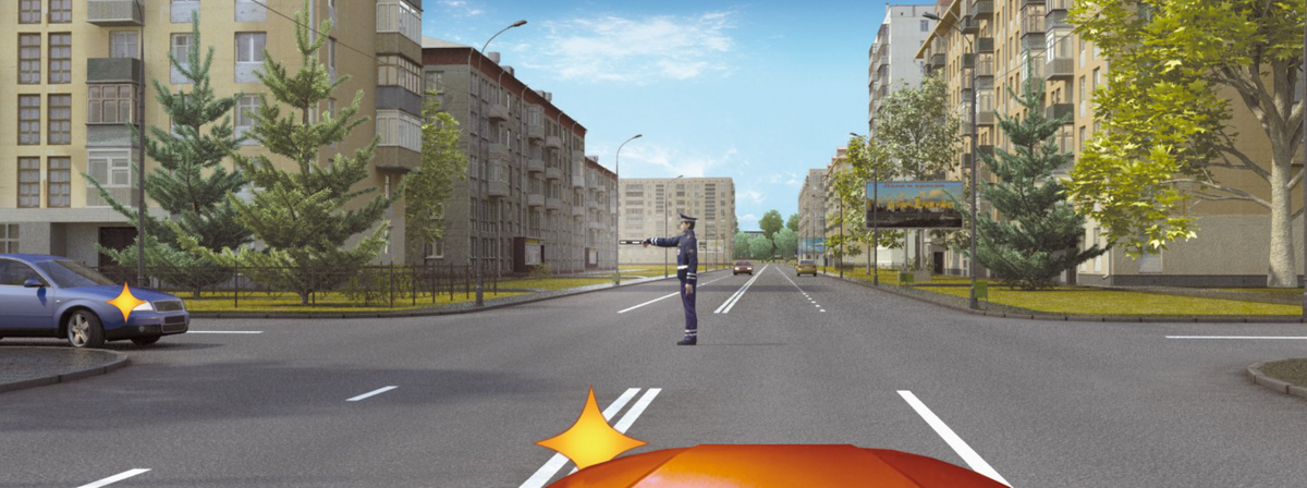 3. Проедете перекресток первым. Такой Сигнал регулировщика разрешает движение нам и легковому автомобилю, при выполнении маневра разворота водитель легкового автомобиля будет являться для нас помехой справа, после того как мы выедем на перекресток, при завершении разворота мы будем обязаны уступить. Эта ситуация регламентированна пунктом 8.9 ПДД В случаях, когда траектории движения транспортных средств пересекаются, а очередность проезда не оговорена Правилами, дорогу должен уступить водитель, к которому транспортное средство приближается справа. Правильный ответ № 2 Выполните разворот, уступив дорогу легковому автомобилю.