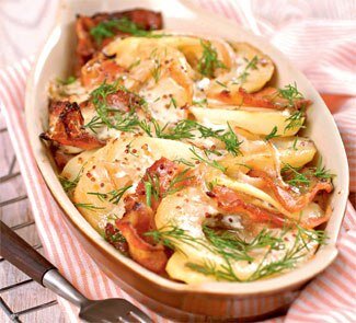 шаг 6 Разогреть духовку до 200 °С. Выложить в смазанную маслом огнеупорную форму кружки картофеля и яблок, бекон и обжаренный лук. Залить сливочной смесью, закрыть сверху фольгой и запекать