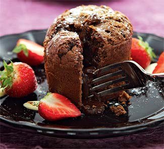 шаг 2 Взбить яйца, желтки и сахар в пену. Добавить в шоколадную смесь, постоянно взбивая венчиком. Всыпать муку и соль, перемешать.Смазать маслом 6 формочек. Распределить между ними тесто. Поставить в разогретую до 200°C духовку и выпекать, пока края кексов не пропекутся (середина при этом должна оставаться мягкой), 7–10 мин. Сразу же вынуть кексы из формочек и подать горячими.
