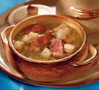 2. Горох промыть, положить в кастрюлю с бульоном, варить 30 мин.