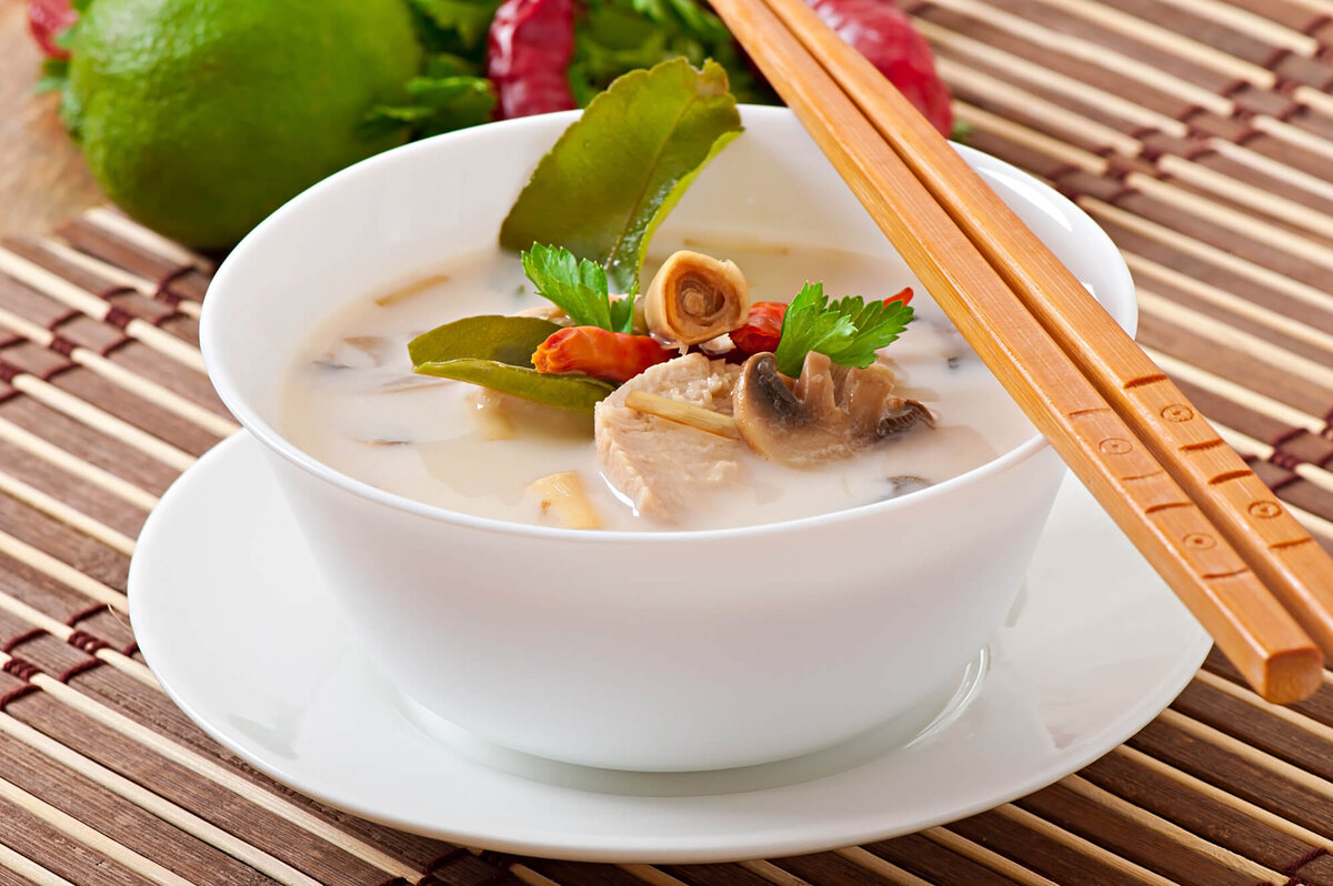 Начнем, как всегда, издалека. Юго-Восточная Азия, Таиланд. Тайская кухня вообще богата на супы — традиции, знаете ли. Вот, например, суп том кха. В отличии от своего собрата, широко известного супа том ям, он не обладает такой атомной жгучестью, а вполне себе респектабельный кисло-сладкий супчик с кокосовым молоком и курицей.