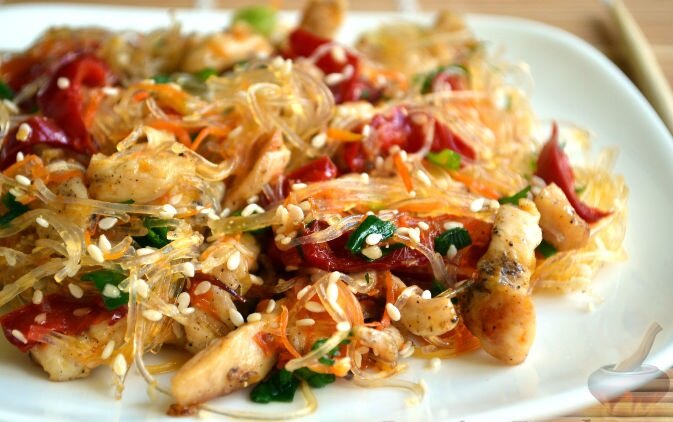 В Китае и Японии "стеклянной" лапшой называют фунчозу. Прозрачная тонкая лапша, без запаха и вкуса. В чем же тогда смысл такой лапши?! Изюминка фунчозы заключается в том, что она принимает аромат и вкус тех ингридиентов, с которыми взаимодействует в блюде. Готовиться она очень быстро, блюда получаются очень вкусными! Китайцы и японцы используют такую лапшу практически в каждом блюде, в России ее еще называют рисовой лапшой, но на самом деле, изготавливается она из бобов. Вам понадобится: Фунчоза 200 г. Курица, филе 1 шт. Перец болгарский(красный) 1 шт. Лук 1 шт. Морковь 1 шт. (маленькая) Соевый соус 2 ст.л. Соль Перец моем, отрезаем верхушку и избавляемся от семян. Нарезаем небольшими кубиками. Лук чистим и мелко шинкуем. Морковь трем на крупной терке(можно мелко порезать). Куриное филе моем, режем на небольшие кусочки(1*1). В тарелке замачиваем курицу в соевом соусе и добавляем соль(соус уже соленый, не переборщите). Закрываем крышкой или пленкой и оставляем мариноваться на 20 минут
