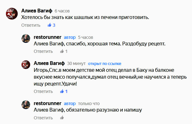 несколько простых способов Вчера я разместил пост о том, как жарил печенку дома по рецепту от известного шеф-повара. Читатель Вагиф Алиев прислал вопрос: Я задал вопрос в фэйсбуке и получил несколько ответов. Рецепты во многом похожи, но есть тонкости. Пусть Вагиф и другие читатели сами выберут, какой вариант им нравится больше. И я буду очень рад, если эти советы помогут Вагифу сделать такой шашлык, который когда-то готовил его отец. Как видим, основное отличие заключается в использовании жира. Кто-то заворачивает в жировую сетку куски, кто-то весь шампур, а кто-то просто нанизывает кусочки жира между кусками печенки. Самый подробный рецепт с картинками прислал Иван Богомолов из Москвы: И еще друзья подсказали, что про оба основных рецепта шашлыка из печенки подробно рассказывал Сталик Ханкишиев. Вот этот ролик: Почитать всё обсуждение целиком можно у меня в фэйсбуке. А рецепт зажарки печенки на обычной сковороде здесь. Присылайте вопросы, буду отвечать всем. И подписывайтесь на