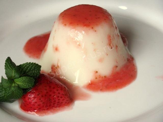 Налив молоко в кастрюльку, добавляем сахара, чтобы немного подсластить, и доводим до кипения. Замачиваем в холодной воде желатиновые листы примерно на 10 мин, затем их отжимаем и добавляем в молоко, размешиваем, чтобы желатин полностью растворился в молоке, и оставляем остудиться. Взбиваем хорошо сливки и перемешиваем вместе с йогуртом в остывшем молоке. Берем форму или небольшие формочки и вливаем полученную массу, помещаем в холодильник, чтобы масса полностью застыла. Перед тем как подать блюдо на стол, окунаем форму с загустевшим десертом в горячу