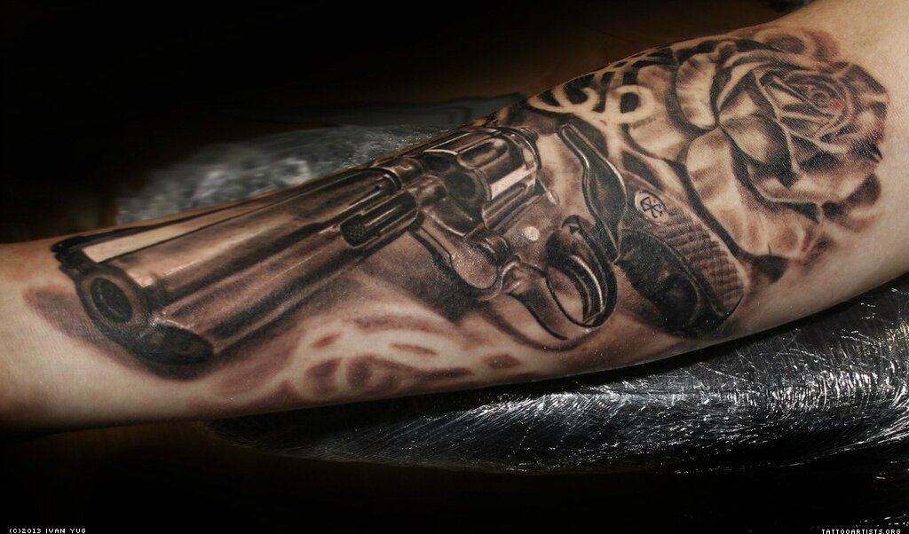 Тату оружие – символ силы, способности противостоять обстоятельствам. Такое изображение чаще выбирают люди, которые признают превосходство физической силы над духовной. Сделать тату с изображением пистолета, кинжала или ножа могут люди, которые готовы вступить в конфликт ради достижения цели. Значение такого изображения может трактоваться по-разному и зависит от приоритетов и мнения самого владельца тату. Рассмотрим самые распространенные. Значение тату оружие практически не меняется, в зависимости от того, на какой части тела оно расположено. Все зависит от того, хочет ли человек демонстрировать рисунок открыто или рассмотреть его можно будет только избранным. Значение тату оружие. Мужские и женские татуировки оружие имеют некоторые различия. В мужских тату вариантах чаще всего фигурируют пистолеты со звездами, парные револьверы, оружие с развернутым дулом. Считается, что это признак брутальности, отсутствия сентиментальности, демонстрация грубости и мужской силы. Женские тату
