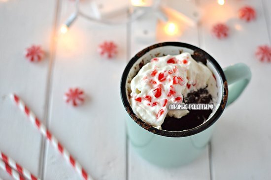 Быстрые рождественские кексы в кружке идеально подойдут для того случая, когда вам абсолютно ничего не хочется готовить или, если вдруг внезапно пришли гости, а вам нужно приготовить что-то вкусненькое очень быстро, то это отличный вариант, ведь они готовятся всего за 5 минут! А еще вы можете подать их на праздничный новогодний стол в качестве теплого и сладкого десерта. Мы поделимся с вами четырьмя очень простыми и оригинальными рождественскими рецептами кексов: кекс красный бархат в кружке, безглютеновый шоколадный кекс с перечной мятой, прянично-имбирный кекс в кружке и самый настоящий рождественский кекс в кружке с марципаном, орехами и сухофруктами (время приготовления чуть больше — 20 минут)! Безглютеновый шоколадный кекс с перечной мятой в кружке за 5 минут Ингредиенты на 1 порцию (кружку) безглютенового шоколадного кекса с перечной мятой и сливками: Для безглютенового шоколадного кекса с перечной мятой: Растопленное сливочное масло или кокосовое — 3 ст. л.