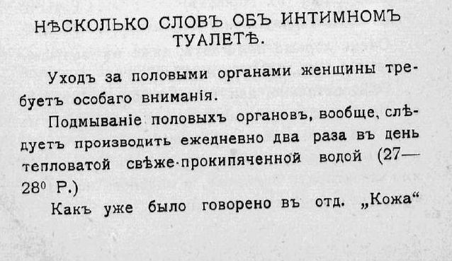 В заметке о женской интимной гигиене из книги 1912 года "Азбука красоты и здоровья. Культура тела" А. Потаповой рассказывается об основах ухода за телом. Например, о регулярном подмывании "марганцево-кислым кали (один-два кристаллика на тазик) или 5% раствором борной кислоты Новый душ-спринцовка "Идеал" для тех, кто привык спринцеваться. Удобен тем, что будучи портативен, дает возможность пользоваться им не только дома, но и в путешествиях. Поскольку прокладки как таковые и тампоны, не говоря уже о менструальных чашах, еще не были изобретены, автор советует при менструации носить бинты, так как всевозможные тряпки, полотенца - крайне неудобны, "они страшно затрудняют движения и во время ходьбы разгорячают половые органы".