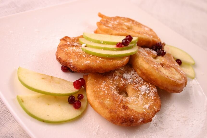 Быстрый и оригинальный рецепт идеальный вариант для вкусного и полезного завтрака. Пончики, хрустящие снаружи, а внутри сочные и сладкие благодаря яблочной начинки. Необходимые продукты: 3 средних яблока, 150 мл молока (если нет молока, можно заменить водой, кефиром, йогуртом или ряженкой), 120 грамм муки, 1 большое куриное яйцо, если яйца маленькие тогда два, 1 ст.л. сахара, щепотка соли, корица по вкусу, сахарная пудра для присыпки пончиков, растительное масло для жарки, бумажное полотенце, чтобы убрать лишний жир с пончиков. Начинаем готовить. Яйцо разделяем на белок и желток. Из молока, муки, желтка, соли и сахара замешиваем тесто, взбивая его венчиком, чтобы не было комочков. Белок сбиваем в течение 3-4 минут до полных пиков, чтобы он не вытекал с перевернутой миски. В несколько заходов аккуратно добавляем наши белки в готовое тесто, перемешиваем очень медленно и нежно от краев в середину, чтобы сохранить воздушность белков, тогда наши пончики будут воздушными. Яблоки моем, очи