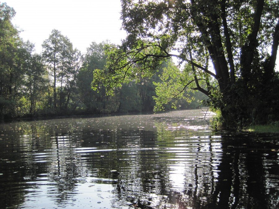 Отплыв от места стоянки,речка стала опять петлять по тростниковым зарослям,но выходы на берег где можно было встать были.Этот участок реки судя по карте пролегал через лес,но лес стоял чуть в отдалении в 200-250 метрах,но иногда подходил вплотную.