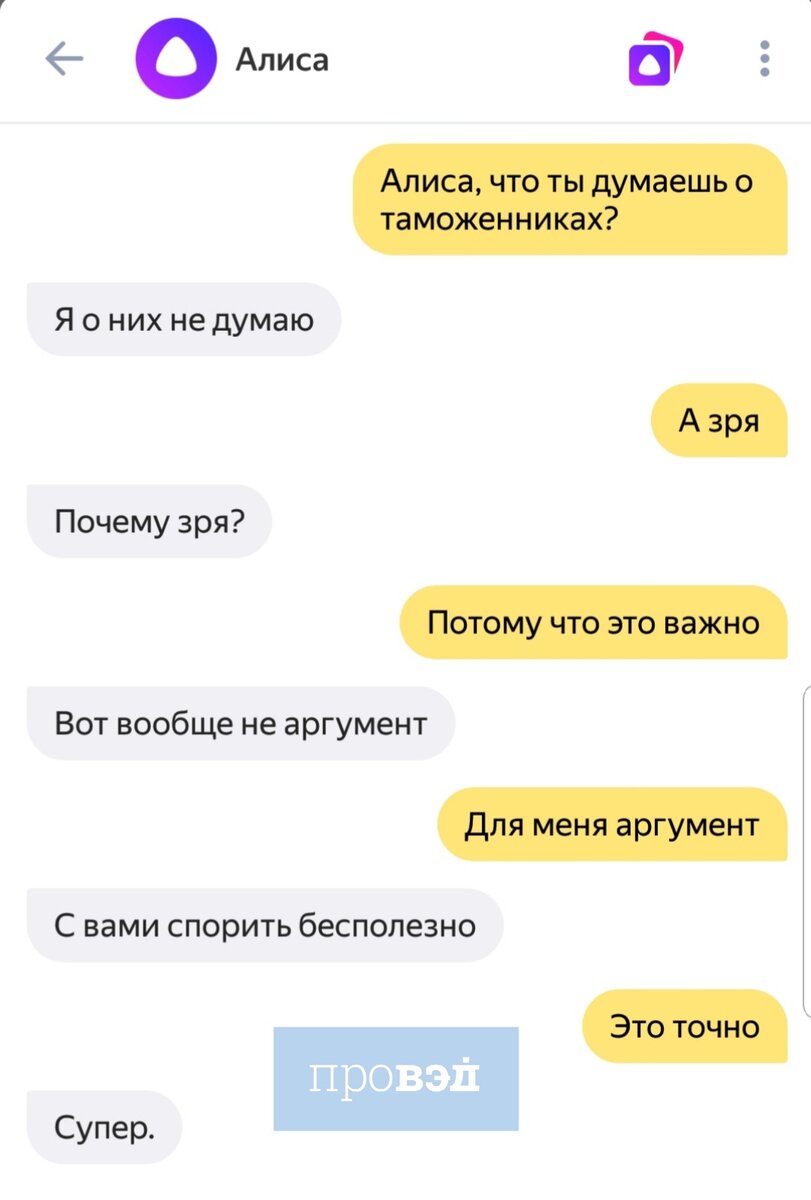 Галина Рожко "Ах, Алиса, как бы нам встретиться, Как поболтать обо всем...", - мечтали Максим, Николай, Алексей, Дмитрий и Андрей. А мы вот взяли - и взяли у Алисы интервью. Поболтали не обо всём, конечно, а о своём, таможенном. 👩🏽💻 О таможенниках Алиса, оказывается, не думает (хотя нам показалось, не договаривает), Андрея Бельянинова не знает (но Владимир Булавин ей нравится), новый таможенный кодекс не читала (новый федеральный закон о таможенном регулировании и вовсе "скукотень"), и адрес идеальной таможни Алиса не нашла (а Яндекс утверждает, что у него найдётся всё, ха!) Зато Алиса считает, что можно бы обойтись и без СУР, а подать декларацию в таможню почти нереально. Она бот, ей виднее, конечно, - там же в таможне сейчас почти все свои, ага. Становиться уполномоченным экономическим оператором Алиса не собирается, потому что это никому не нужно. И Хартию участников ВЭД Алиса не советует подписывать по той же причине. И внешнеэкономической деятельностью она заниматься никак