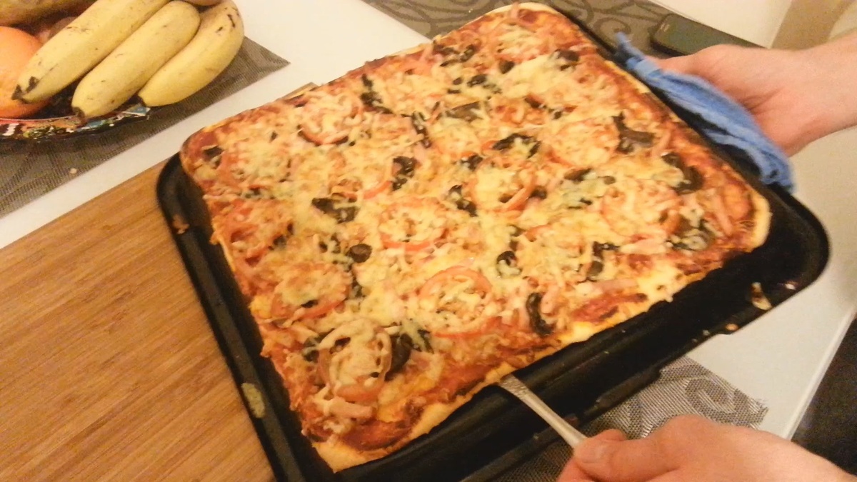 Всегда удобно иметь нарезанные запасы в морозильнике! Открыли банку огурцов, наелись, парочка осталась - крошим кубиками и в морозилку. Вялили помидорами, сердцевину вырезали и теперь не знаете, куда деть? В морозильную камеру. Кстати, отваренные грибы с осени тоже так удобно хранить. Покупаем в пекарне готовое тесто за рублей 50 и сыр из дешёвых, рублей на 80-100 - в расплавленном состоянии на пицце вкусовые качества сыра перемешаются с другими вкусами, так что не стоит беспокоиться. Кг теста хватает на две средние пиццы. Раскатываем на смазанный маслом противень кусок теста, сверху - кетчуп или даже томатную пасту, огурчики, помидорки, грибы. Если Вы богаты и у Вас есть колбаса - добавьте её. ) Но, уверяю, без нее пицца получается весьма и весьма неплоха. Противень ставим в разогретую духовку на минут 10 при температуре 150-180 градусов (на самом деле все духовки разные, поэтому следите за тем, как начинают слегка подрумяниваться дно и бока теста). После посыпаете пиццу тёртым сы