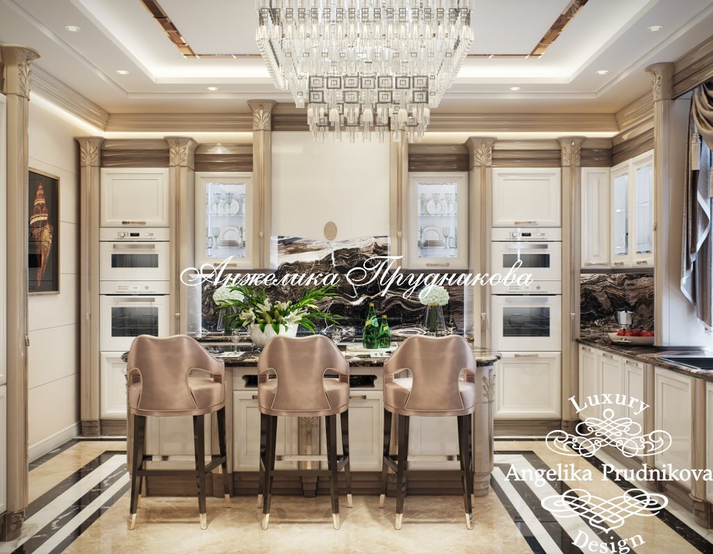 Дизайн интерьера кухни на фото специалисты Студии Анжелики Прудниковой решили в стиле современного арт-деко, выбрав для ее оформления светлую цветовую гамму с широким спектром кремовых и бежевых оттенков. Глянцевые фасады шкафов и зеркальный декор добавили обстановке торжественности, а столешницы и фартук из нарядного мрамора сорта Emperador Dark с эффектной структурой сделали интерьер выразительным.