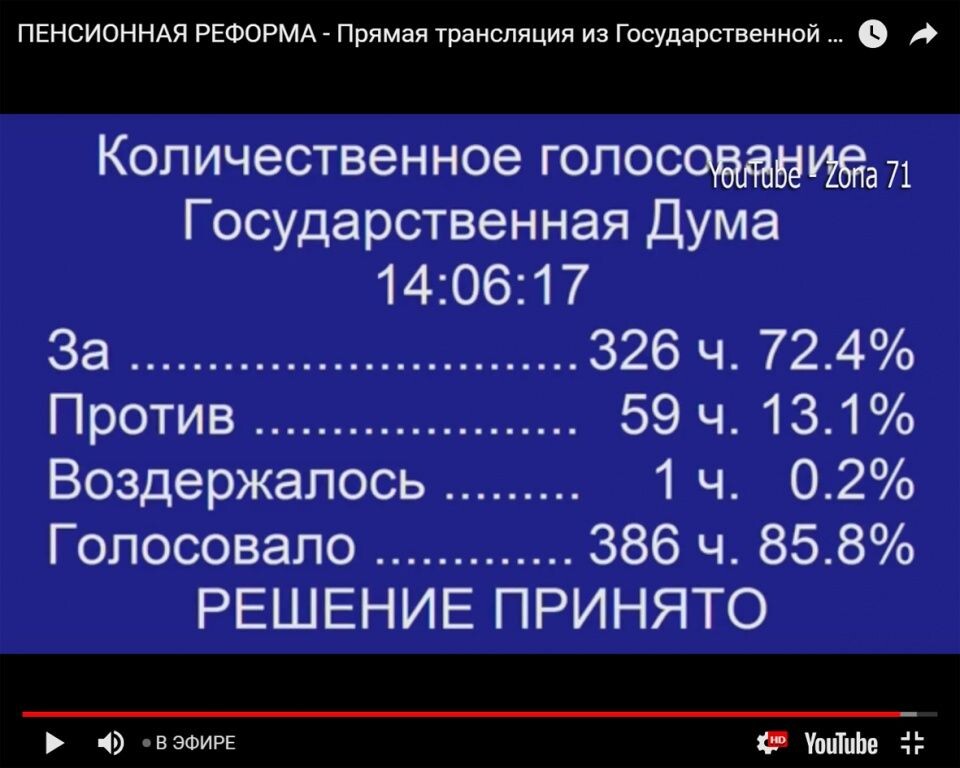 Трансляция шла в прямом эфире (текстовую версию можно посмотреть здесь). В итоге поправки, внесенные Президентом РФ и смягчающие нормы законопроекта, принятого летом в первом чтении, парламентарии одобрили единогласно. Среди участников пленарного заседания, представляющих все фракции политических партий, не было ни противников перемен, ни тех, кому есть что возразить. Источник: https://www.ks-yanao.ru/vlast/zakonoproekt-o-sovershenstvovanii-pensionnoy-sistemy-prinyat-vo-vtorom-chtenii.html