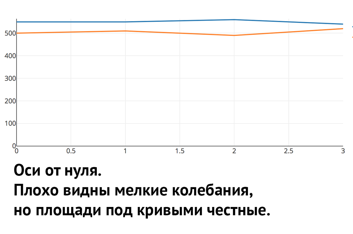 Оси не от нуля делать можно. Но только в тех случаях, когда вы уверены, что читатели это видят и могут правильно интерпретировать. В чём вообще проблема? Когда ось начинается от нуля, расстояние от точки (например, на кривой) до края графика равно значению этой точки. Посмотрите на график ниже. Это всем привычный формат. Но когда колебания в значениях незначительны, с осью от нуля они будут почти не видны. Обратите внимание на синюю линию. Почти прямая. Тут появляются оси не от нуля. Мы как бы приблизились в нужный участок картинки (смотрите на следующий график). Теперь характер колебаний гораздо заметнее. Такой формат допустим, когда читателю важны именно эти небольшие изменения и он знает, что площади под кривой сравнивать нельзя. Но если читатель этого не понимает, он может сделать неверные выводы. На примере ниже можно подумать, что значения по синей кривой в разы больше, чем по рыжей. Хотя на первом графике мы видели, что они почти равны. Ошибиться можно даже если кривая только од