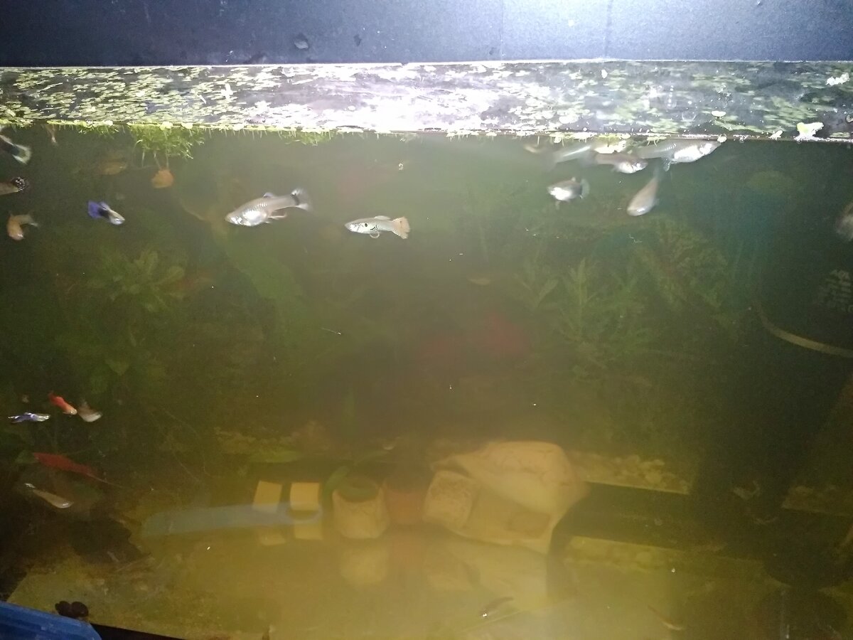 Как и самые простые в разведении, пожалуй, гуппи: это "тараканы" аквариума - всеядные, живущие при широком диапазоне температур (от 22 до 28*С) рыбки, которые прекрасно уживаются с любыми другими видами (которые не съедят их, естественно), весьма плодовиты и хорошо переносят самые разные "проблемы" окружающей среды. Помимо всего прочего они очень красивы, и в "чистой" воде (без окраса после применения всяческих кондиционеров для воды или простой "замутненности" от грязи) гуппи выглядят очень красочно, особенно когда их много - ваш аквариум будет переливаться всеми цветами радуги в самых невероятных комбинациях. При объеме в более 50 литров можно заселять аквариум исходя из расчёта "1 литр воды / 1 шт. гуппи" ("по науке", конечно, рекомендации 2-3 и вплоть до 5 л. на 1 шт., однако, они всё более актуальны для малых объемов аквариума до 50 л., в которых рыбкам невозможно "наматывать километраж" и потому они чувствуют себя стесненно, кроме того в таких объемах практически невозможно успе